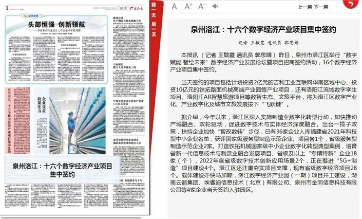 今年以來,洛江區(qū)委、區(qū)政府深入開展“1+3”專項(xiàng)行動(dòng),實(shí)施制造業(yè)數(shù)字化轉(zhuǎn)型行動(dòng),通過出臺(tái)《洛江區(qū)制造業(yè)數(shù)字化轉(zhuǎn)型實(shí)施方案》等一系列政策措施,支持企業(yè)加快“智改數(shù)轉(zhuǎn)”步伐,目前已有36家企業(yè)入庫福建省2021年科技型中小企業(yè)名單,獲評(píng)國家級(jí)服務(wù)型制造示范企業(yè)、項(xiàng)目2個(gè),省級(jí)服務(wù)型制造示范企業(yè)2家。同時(shí),成功打造鐵拓機(jī)械國家級(jí)中小企業(yè)數(shù)字化轉(zhuǎn)型典型案例,培育省新一代信息技術(shù)與制造業(yè)融合發(fā)展項(xiàng)目、省級(jí)及以上“專精特新”企業(yè)18家、2022年度省級(jí)數(shù)字技術(shù)創(chuàng)新應(yīng)用場(chǎng)景2個(gè),正在推進(jìn)“5G+制造”項(xiàng)目建設(shè)4個(gè)。并以第五屆數(shù)字中國建設(shè)峰會(huì)為契機(jī),策劃推動(dòng)6個(gè)項(xiàng)目列入省數(shù)字經(jīng)濟(jì)項(xiàng)目,全區(qū)現(xiàn)有省級(jí)數(shù)字經(jīng)濟(jì)項(xiàng)目28個(gè),今年來已完成投資12.86億元。此外,洛江數(shù)字經(jīng)濟(jì)產(chǎn)業(yè)園(一期)項(xiàng)目順利開工建設(shè),湖南云箭集團(tuán)、埃睿迪信息技術(shù)(北京)有限公司、泉州市金同信息科技有限公司、泉州市綠普森生物科技有限公司等4家企業(yè)成功簽約入駐園區(qū),數(shù)字技術(shù)與實(shí)體經(jīng)濟(jì)得到深度融合。